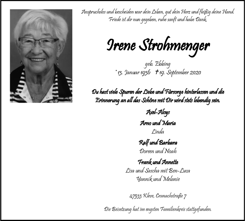 Hier finden Sie alle Traueranzeigen aus der Zeitung, die bisher für Irene Strohmenger erschienen sind. Weitere Traueranzeigen, die in der Zeitung erscheinen, werden hier ebenfalls aufgelistet