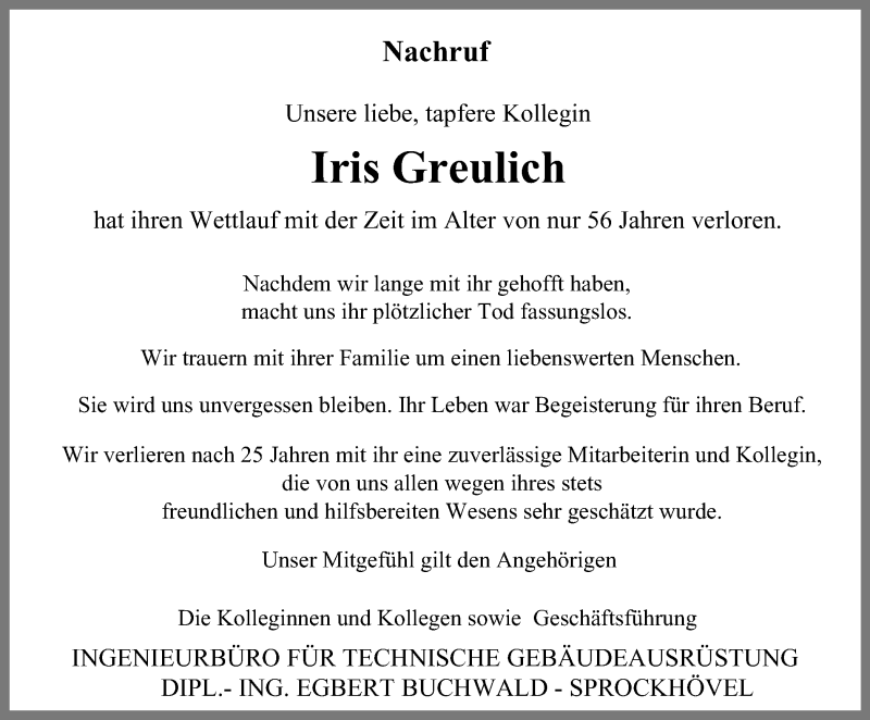 Hier finden Sie alle Traueranzeigen aus der Zeitung, die bisher für Iris Greulich erschienen sind. Weitere Traueranzeigen, die in der Zeitung erscheinen, werden hier ebenfalls aufgelistet
