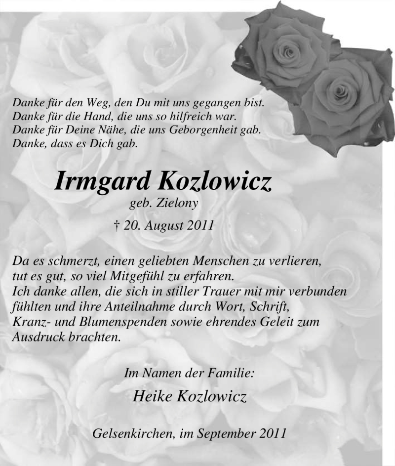 Hier finden Sie alle Traueranzeigen aus der Zeitung, die bisher für Irmgard Kozlowicz erschienen sind. Weitere Traueranzeigen, die in der Zeitung erscheinen, werden hier ebenfalls aufgelistet