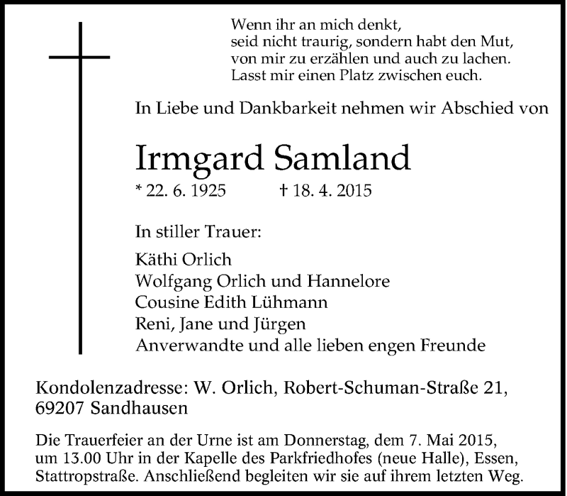 Hier finden Sie alle Traueranzeigen aus der Zeitung, die bisher für Irmgard Samland erschienen sind. Weitere Traueranzeigen, die in der Zeitung erscheinen, werden hier ebenfalls aufgelistet