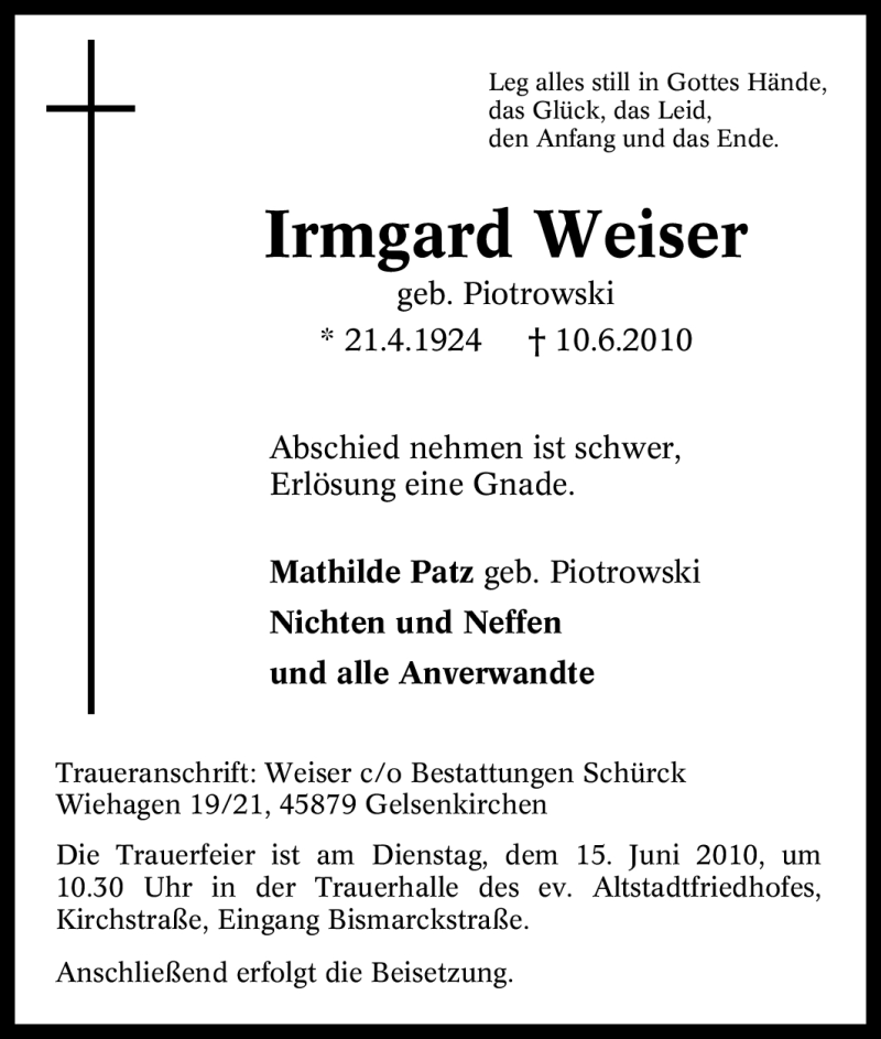 Hier finden Sie alle Traueranzeigen aus der Zeitung, die bisher für Irmgard Weiser erschienen sind. Weitere Traueranzeigen, die in der Zeitung erscheinen, werden hier ebenfalls aufgelistet