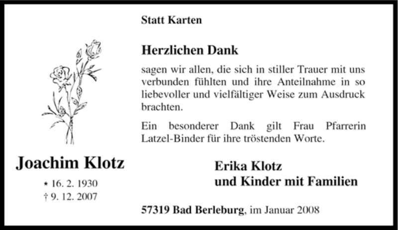 Hier finden Sie alle Traueranzeigen aus der Zeitung, die bisher für Joachim Klotz erschienen sind. Weitere Traueranzeigen, die in der Zeitung erscheinen, werden hier ebenfalls aufgelistet