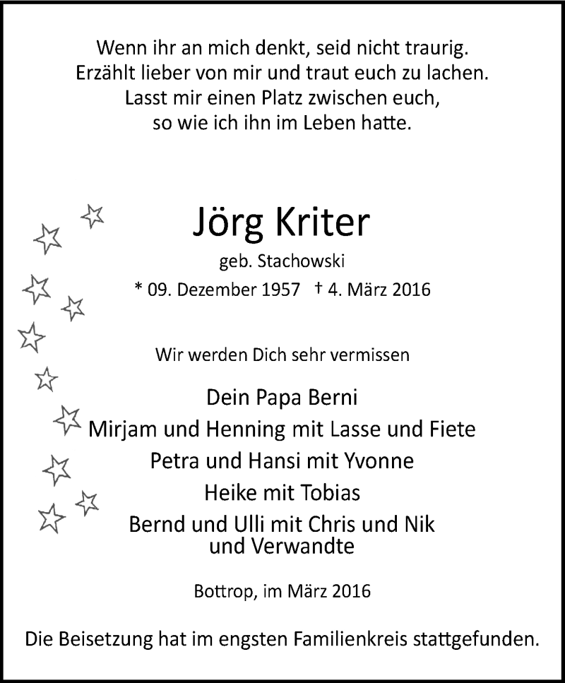 Hier finden Sie alle Traueranzeigen aus der Zeitung, die bisher für Jörg Kriter erschienen sind. Weitere Traueranzeigen, die in der Zeitung erscheinen, werden hier ebenfalls aufgelistet