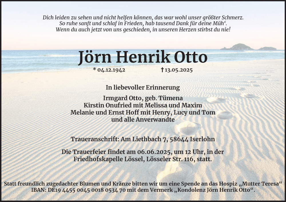 Hier finden Sie alle Traueranzeigen aus der Zeitung, die bisher für Jörn Henrik Otto erschienen sind. Weitere Traueranzeigen, die in der Zeitung erscheinen, werden hier ebenfalls aufgelistet