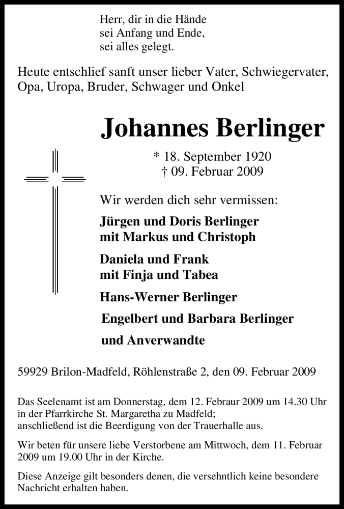 Hier finden Sie alle Traueranzeigen aus der Zeitung, die bisher für Johannes Berlinger erschienen sind. Weitere Traueranzeigen, die in der Zeitung erscheinen, werden hier ebenfalls aufgelistet