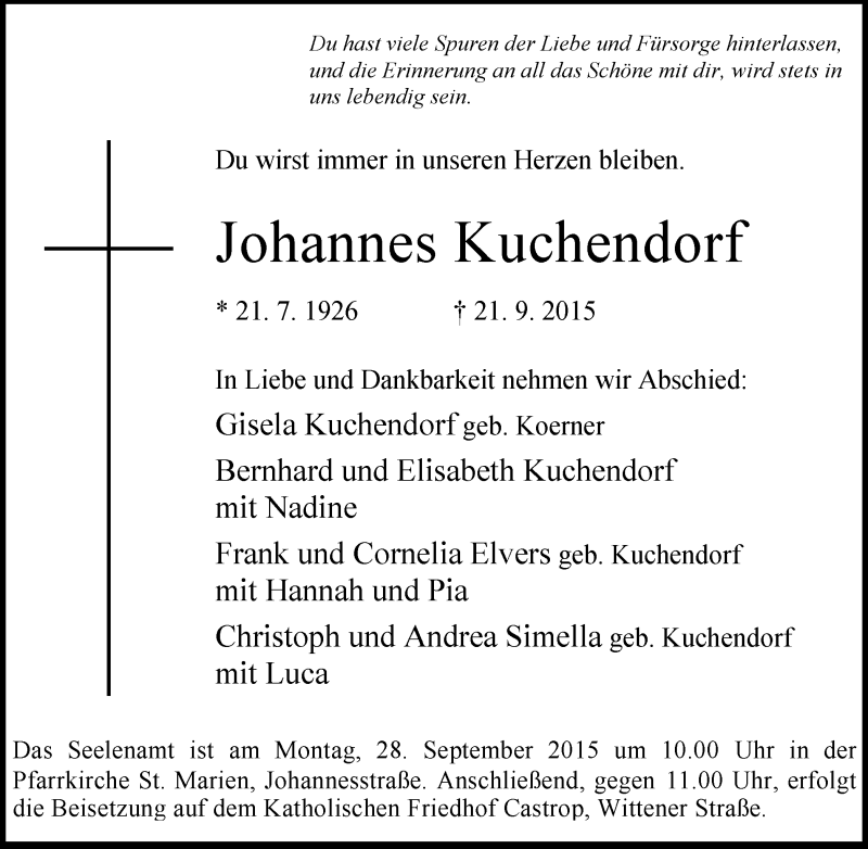 Hier finden Sie alle Traueranzeigen aus der Zeitung, die bisher für Johannes Kuchendorf erschienen sind. Weitere Traueranzeigen, die in der Zeitung erscheinen, werden hier ebenfalls aufgelistet
