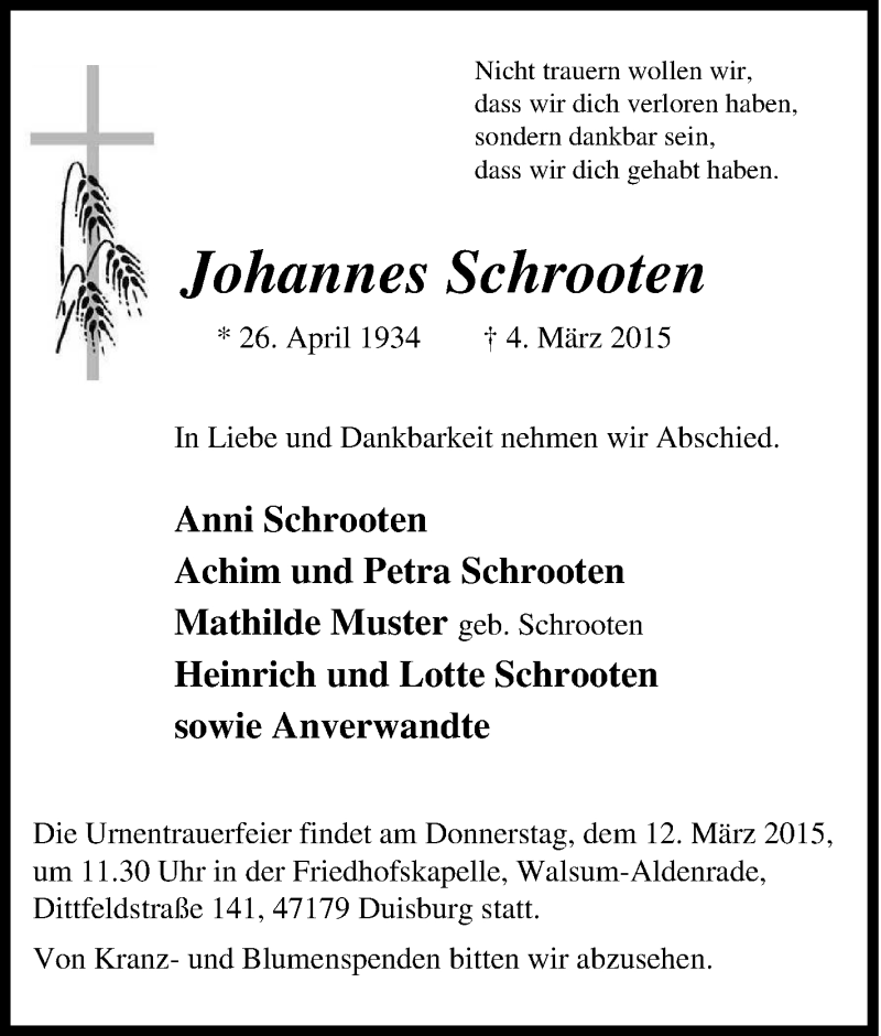 Hier finden Sie alle Traueranzeigen aus der Zeitung, die bisher für Johannes Schrooten erschienen sind. Weitere Traueranzeigen, die in der Zeitung erscheinen, werden hier ebenfalls aufgelistet
