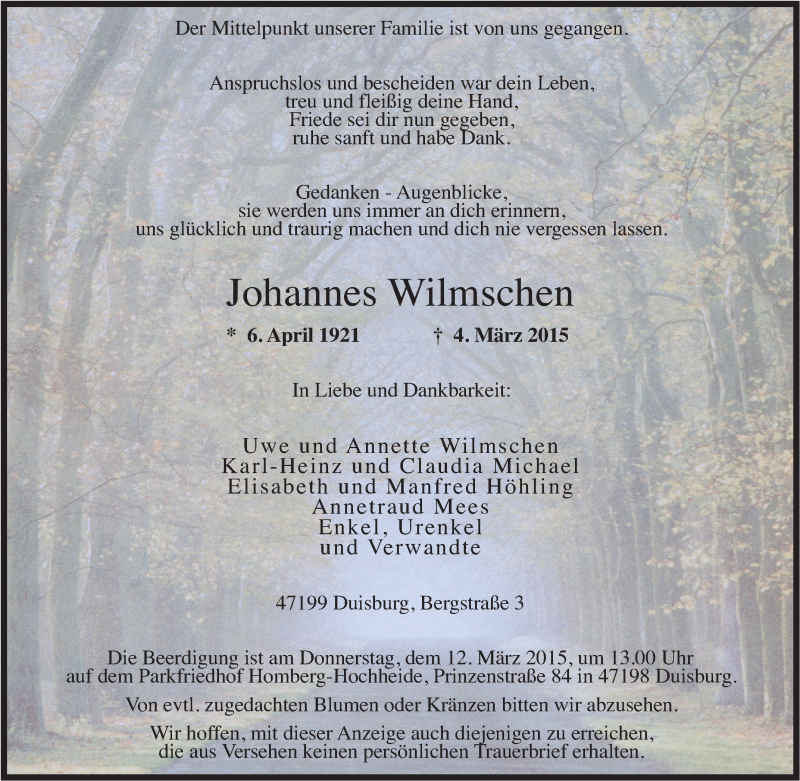 Hier finden Sie alle Traueranzeigen aus der Zeitung, die bisher für Johannes Wilmschen erschienen sind. Weitere Traueranzeigen, die in der Zeitung erscheinen, werden hier ebenfalls aufgelistet