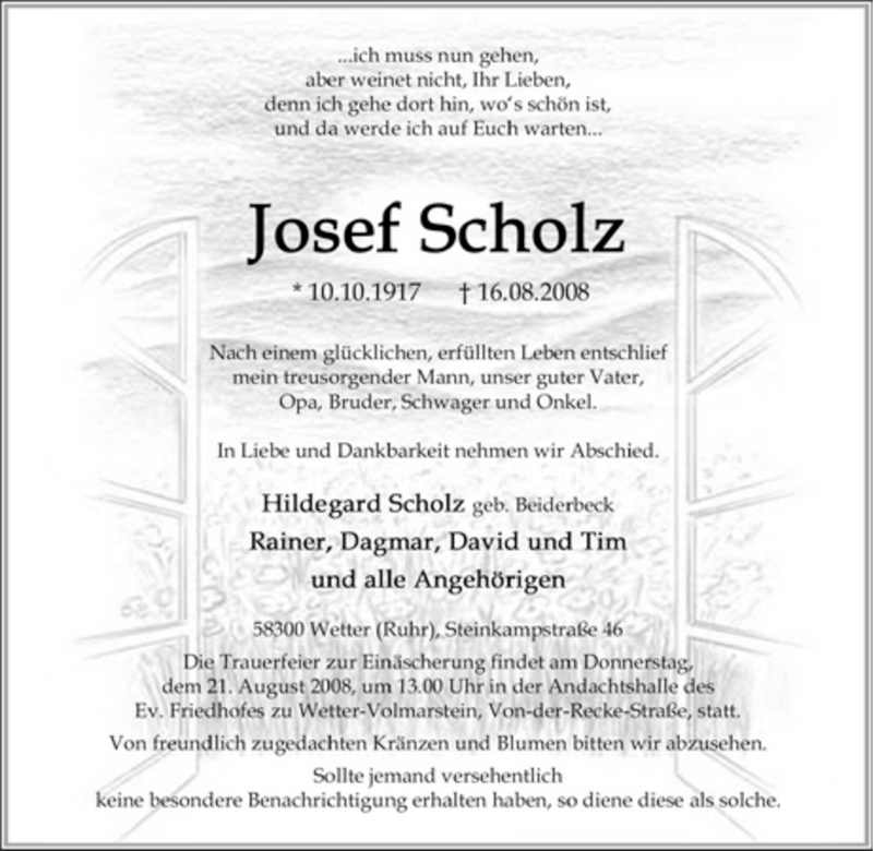 Hier finden Sie alle Traueranzeigen aus der Zeitung, die bisher für Josef Scholz erschienen sind. Weitere Traueranzeigen, die in der Zeitung erscheinen, werden hier ebenfalls aufgelistet