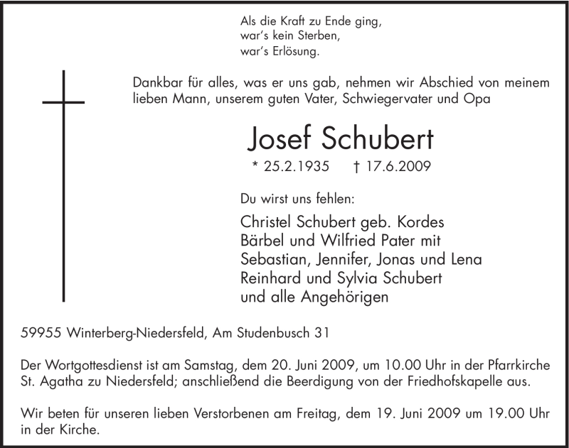 Hier finden Sie alle Traueranzeigen aus der Zeitung, die bisher für Josef Schubert erschienen sind. Weitere Traueranzeigen, die in der Zeitung erscheinen, werden hier ebenfalls aufgelistet