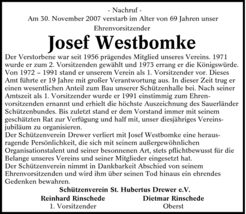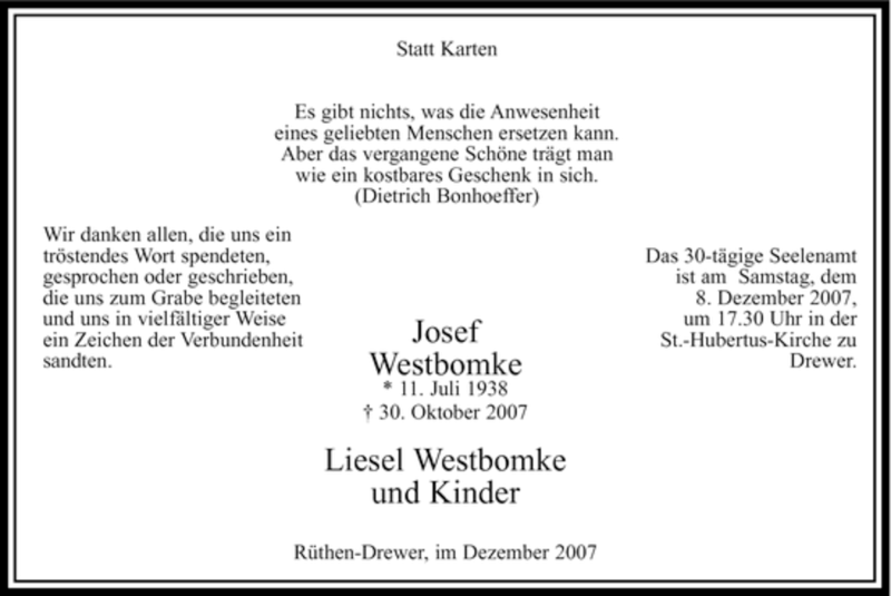 Hier finden Sie alle Traueranzeigen aus der Zeitung, die bisher für Josef Westbomke erschienen sind. Weitere Traueranzeigen, die in der Zeitung erscheinen, werden hier ebenfalls aufgelistet