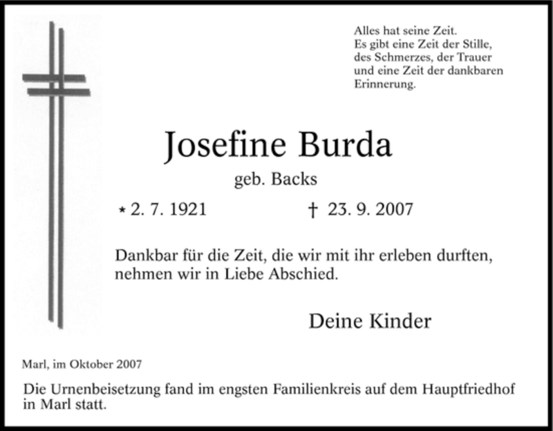 Hier finden Sie alle Traueranzeigen aus der Zeitung, die bisher für Josefine Burda erschienen sind. Weitere Traueranzeigen, die in der Zeitung erscheinen, werden hier ebenfalls aufgelistet