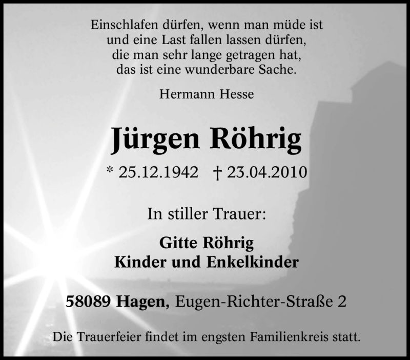 Hier finden Sie alle Traueranzeigen aus der Zeitung, die bisher für Jürgen Röhrig erschienen sind. Weitere Traueranzeigen, die in der Zeitung erscheinen, werden hier ebenfalls aufgelistet