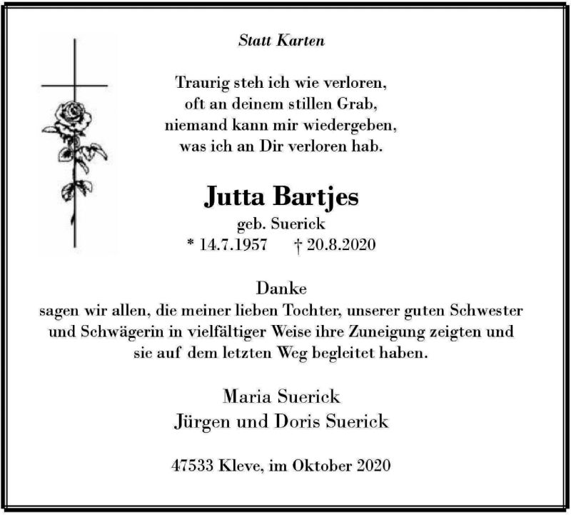 Hier finden Sie alle Traueranzeigen aus der Zeitung, die bisher für Jutta Bartjes erschienen sind. Weitere Traueranzeigen, die in der Zeitung erscheinen, werden hier ebenfalls aufgelistet