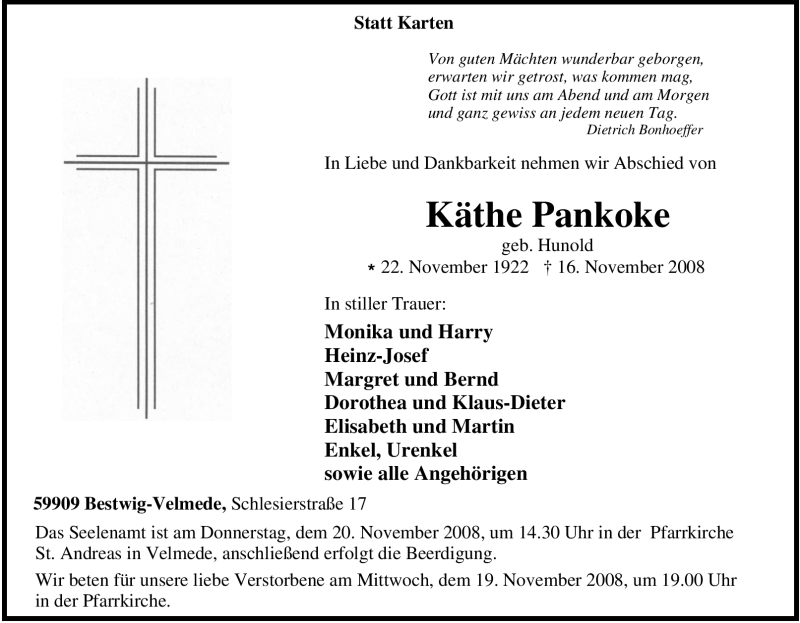 Hier finden Sie alle Traueranzeigen aus der Zeitung, die bisher für Käthe Pankoke erschienen sind. Weitere Traueranzeigen, die in der Zeitung erscheinen, werden hier ebenfalls aufgelistet