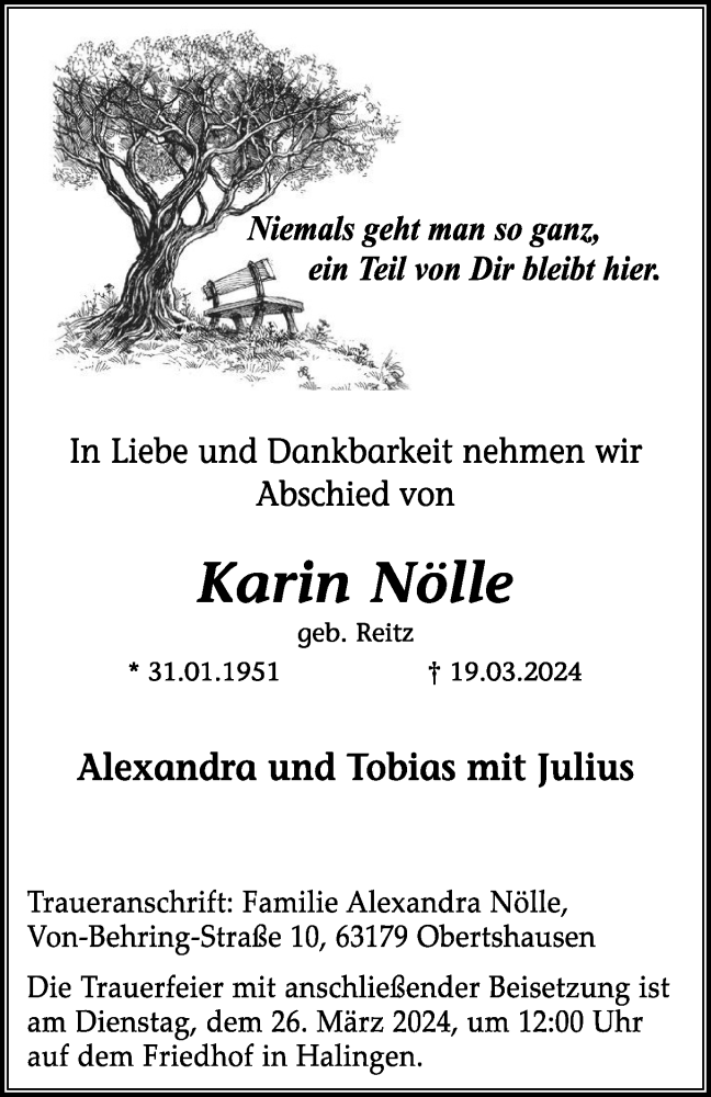 Hier finden Sie alle Traueranzeigen aus der Zeitung, die bisher für Karin Nölle erschienen sind. Weitere Traueranzeigen, die in der Zeitung erscheinen, werden hier ebenfalls aufgelistet