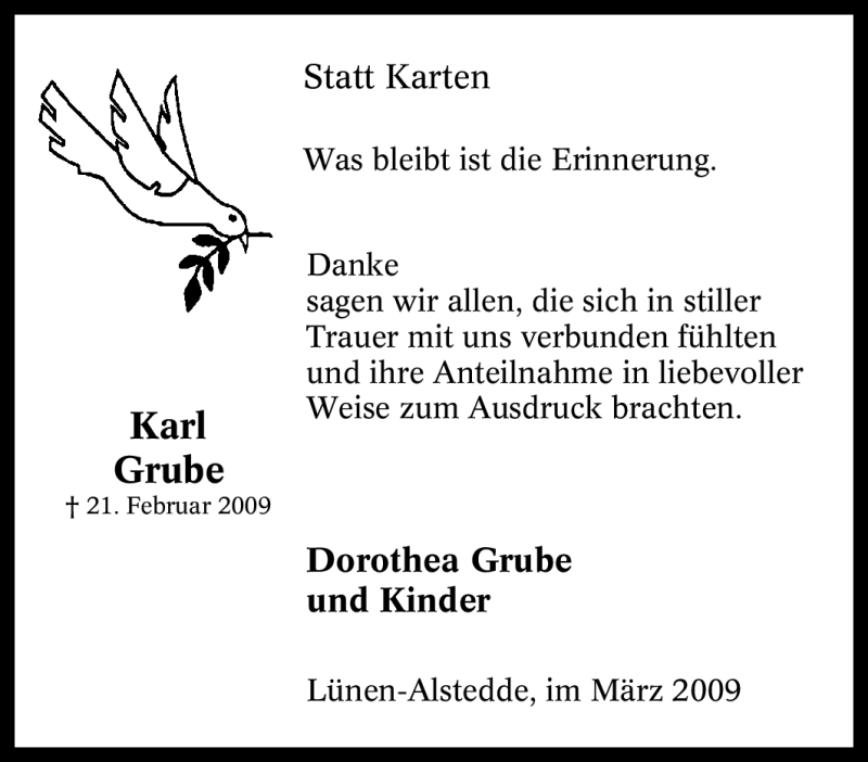 Hier finden Sie alle Traueranzeigen aus der Zeitung, die bisher für Karl Grube erschienen sind. Weitere Traueranzeigen, die in der Zeitung erscheinen, werden hier ebenfalls aufgelistet