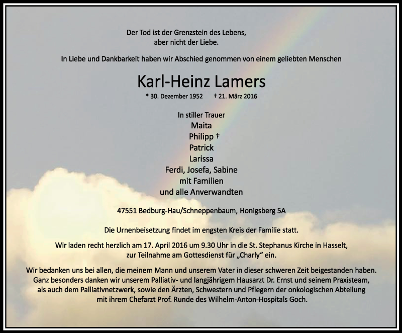 Hier finden Sie alle Traueranzeigen aus der Zeitung, die bisher für Karl-Heinz Lamers erschienen sind. Weitere Traueranzeigen, die in der Zeitung erscheinen, werden hier ebenfalls aufgelistet