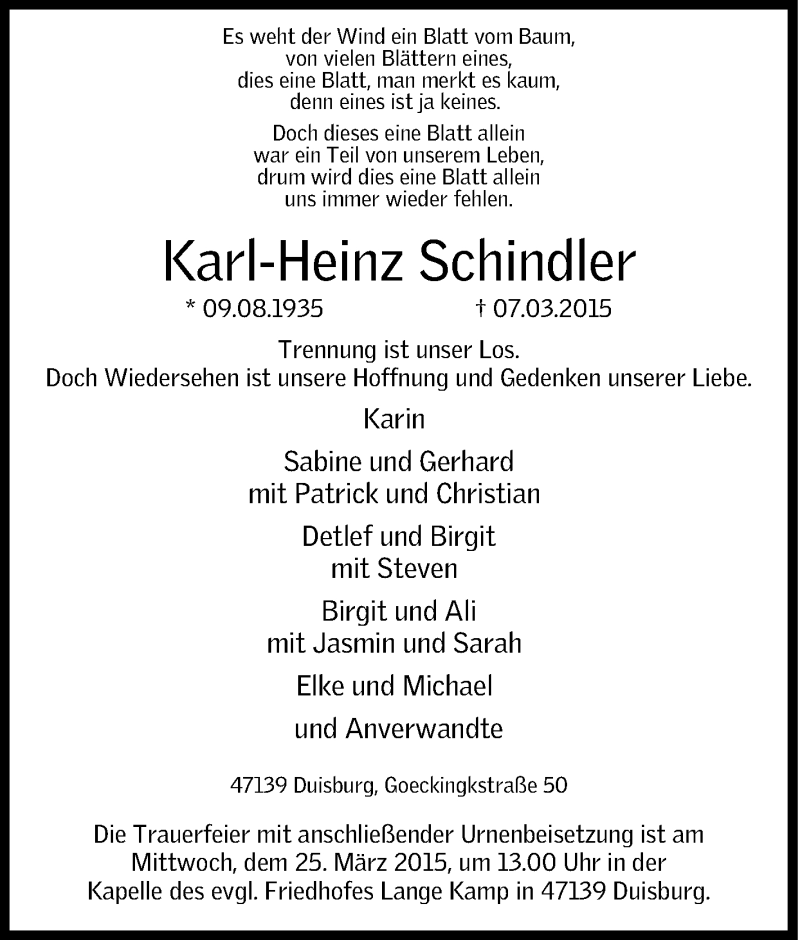 Hier finden Sie alle Traueranzeigen aus der Zeitung, die bisher für Karl-Heinz Schindler erschienen sind. Weitere Traueranzeigen, die in der Zeitung erscheinen, werden hier ebenfalls aufgelistet