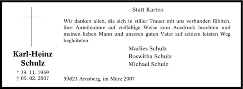Hier finden Sie alle Traueranzeigen aus der Zeitung, die bisher für Karl-Heinz Schulz erschienen sind. Weitere Traueranzeigen, die in der Zeitung erscheinen, werden hier ebenfalls aufgelistet