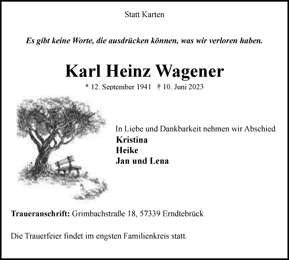 Hier finden Sie alle Traueranzeigen aus der Zeitung, die bisher für Karl Heinz Wagener erschienen sind. Weitere Traueranzeigen, die in der Zeitung erscheinen, werden hier ebenfalls aufgelistet