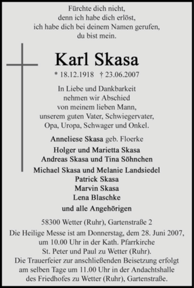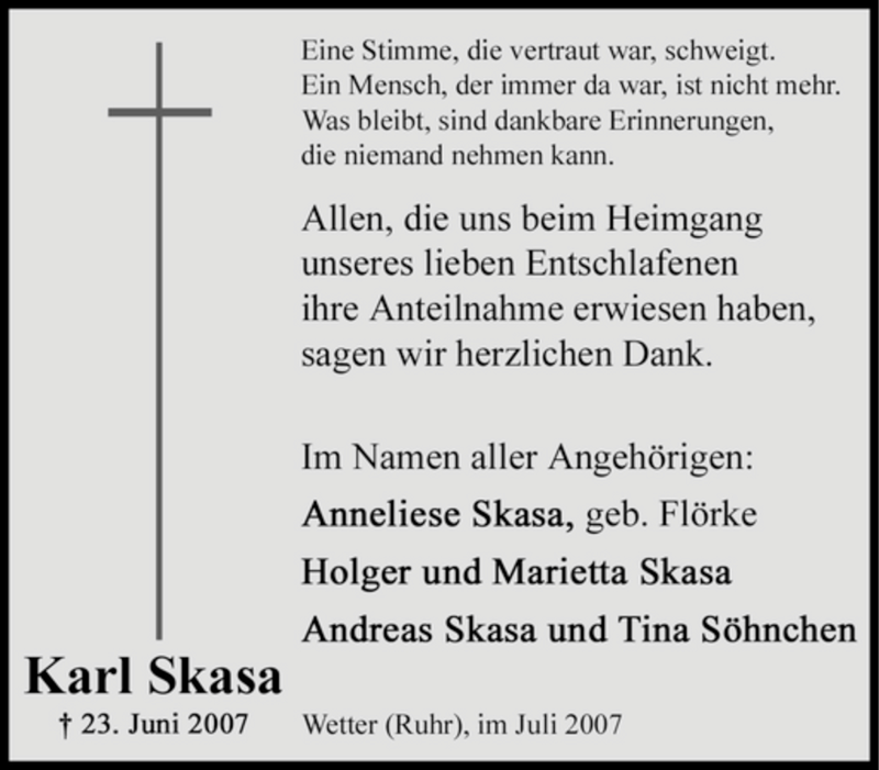 Hier finden Sie alle Traueranzeigen aus der Zeitung, die bisher für Karl Skasa erschienen sind. Weitere Traueranzeigen, die in der Zeitung erscheinen, werden hier ebenfalls aufgelistet