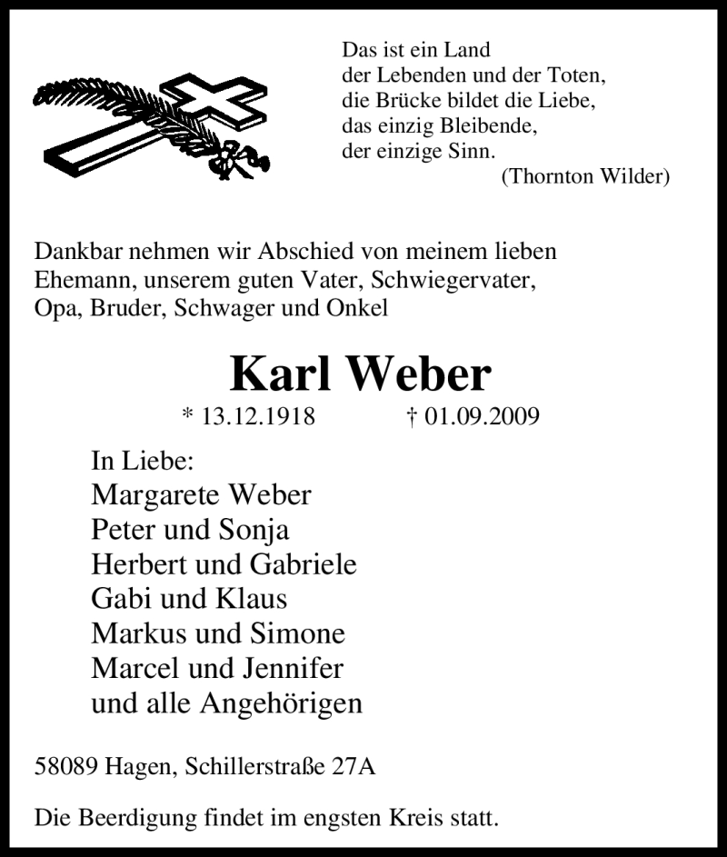 Hier finden Sie alle Traueranzeigen aus der Zeitung, die bisher für Karl Weber erschienen sind. Weitere Traueranzeigen, die in der Zeitung erscheinen, werden hier ebenfalls aufgelistet