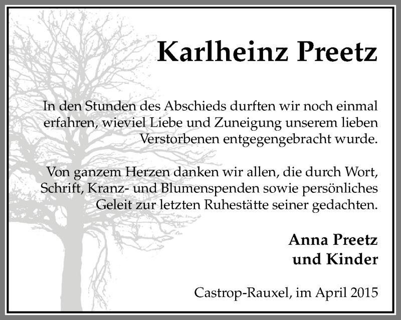 Hier finden Sie alle Traueranzeigen aus der Zeitung, die bisher für Karlheinz Preetz erschienen sind. Weitere Traueranzeigen, die in der Zeitung erscheinen, werden hier ebenfalls aufgelistet