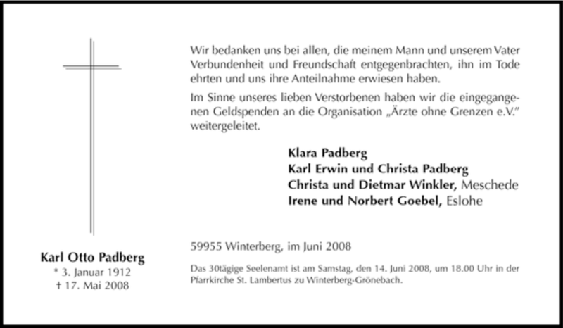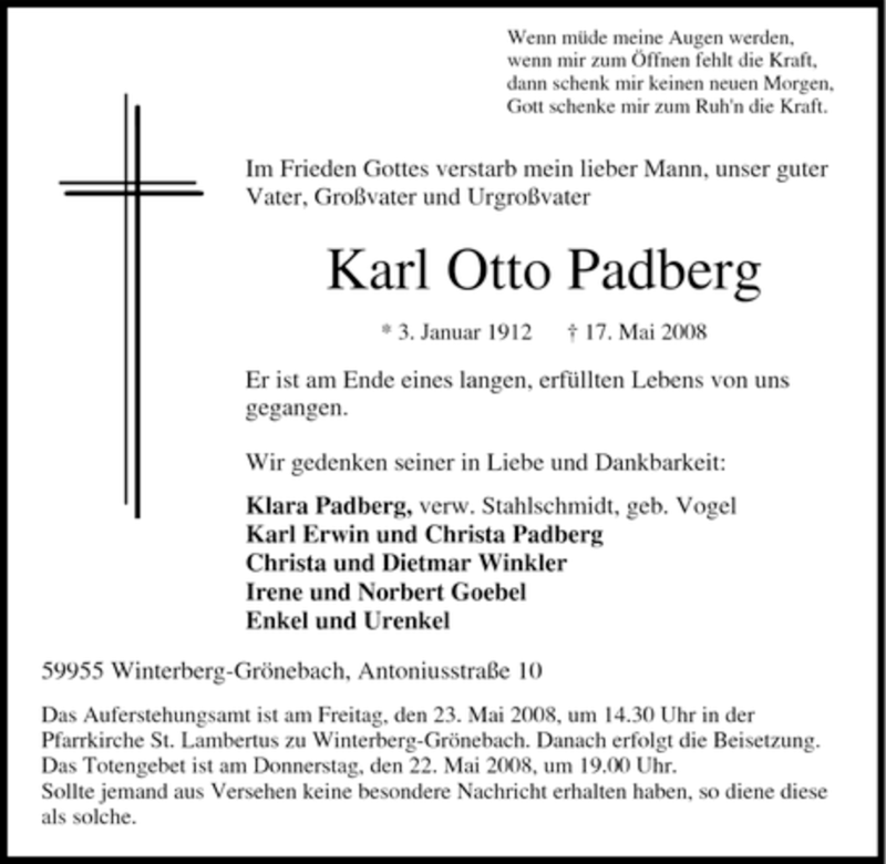 Hier finden Sie alle Traueranzeigen aus der Zeitung, die bisher für Karl Otto Padberg erschienen sind. Weitere Traueranzeigen, die in der Zeitung erscheinen, werden hier ebenfalls aufgelistet