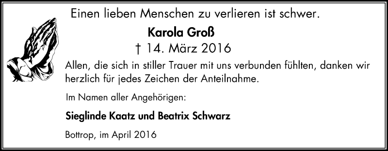 Hier finden Sie alle Traueranzeigen aus der Zeitung, die bisher für Karola Groß erschienen sind. Weitere Traueranzeigen, die in der Zeitung erscheinen, werden hier ebenfalls aufgelistet