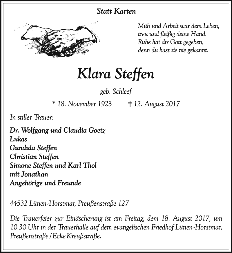 Hier finden Sie alle Traueranzeigen aus der Zeitung, die bisher für Klara Steffen erschienen sind. Weitere Traueranzeigen, die in der Zeitung erscheinen, werden hier ebenfalls aufgelistet