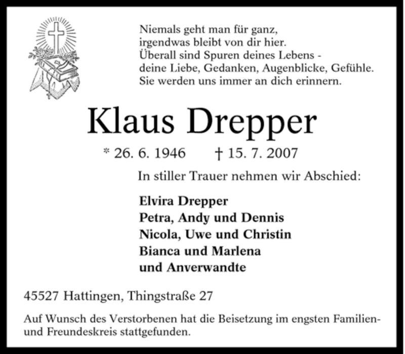 Hier finden Sie alle Traueranzeigen aus der Zeitung, die bisher für Klaus Drepper erschienen sind. Weitere Traueranzeigen, die in der Zeitung erscheinen, werden hier ebenfalls aufgelistet