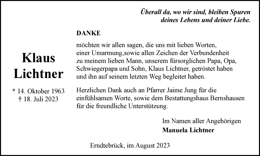 Hier finden Sie alle Traueranzeigen aus der Zeitung, die bisher für Klaus Lichtner erschienen sind. Weitere Traueranzeigen, die in der Zeitung erscheinen, werden hier ebenfalls aufgelistet