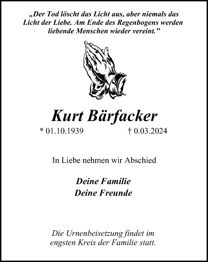 Hier finden Sie alle Traueranzeigen aus der Zeitung, die bisher für Kurt Bärfacker erschienen sind. Weitere Traueranzeigen, die in der Zeitung erscheinen, werden hier ebenfalls aufgelistet
