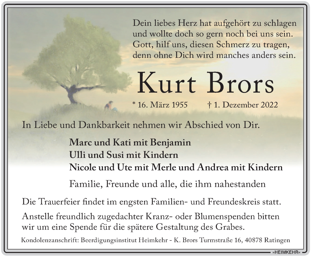Hier finden Sie alle Traueranzeigen aus der Zeitung, die bisher für Kurt Brors erschienen sind. Weitere Traueranzeigen, die in der Zeitung erscheinen, werden hier ebenfalls aufgelistet