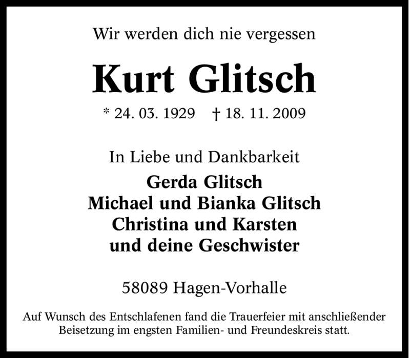 Hier finden Sie alle Traueranzeigen aus der Zeitung, die bisher für Kurt Glitsch erschienen sind. Weitere Traueranzeigen, die in der Zeitung erscheinen, werden hier ebenfalls aufgelistet