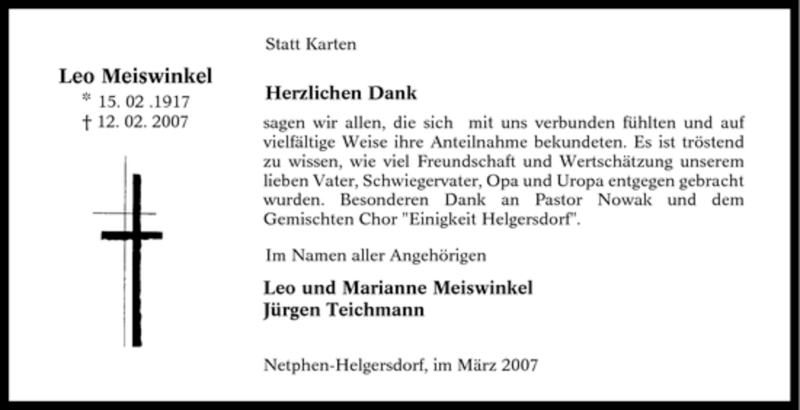 Hier finden Sie alle Traueranzeigen aus der Zeitung, die bisher für Leo Meiswinkel erschienen sind. Weitere Traueranzeigen, die in der Zeitung erscheinen, werden hier ebenfalls aufgelistet