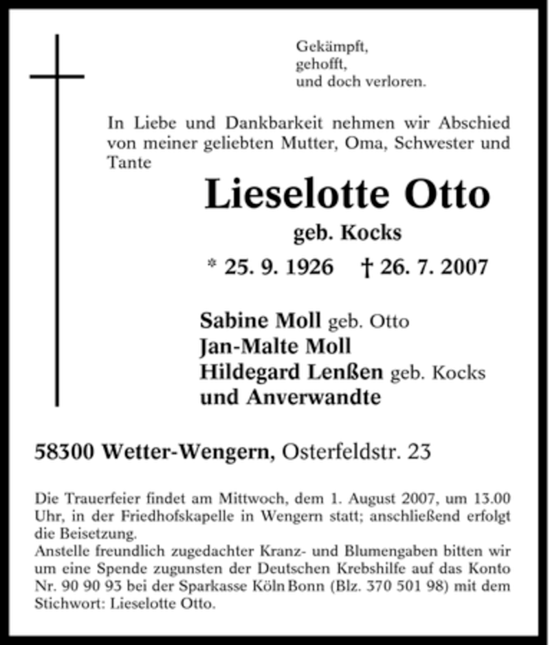 Hier finden Sie alle Traueranzeigen aus der Zeitung, die bisher für Lieselotte Otto erschienen sind. Weitere Traueranzeigen, die in der Zeitung erscheinen, werden hier ebenfalls aufgelistet
