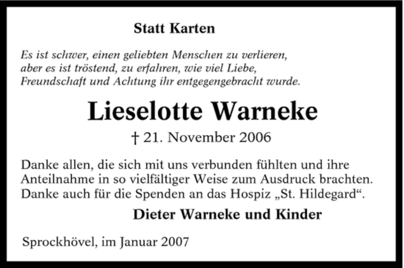 Hier finden Sie alle Traueranzeigen aus der Zeitung, die bisher für Lieselotte Warneke erschienen sind. Weitere Traueranzeigen, die in der Zeitung erscheinen, werden hier ebenfalls aufgelistet
