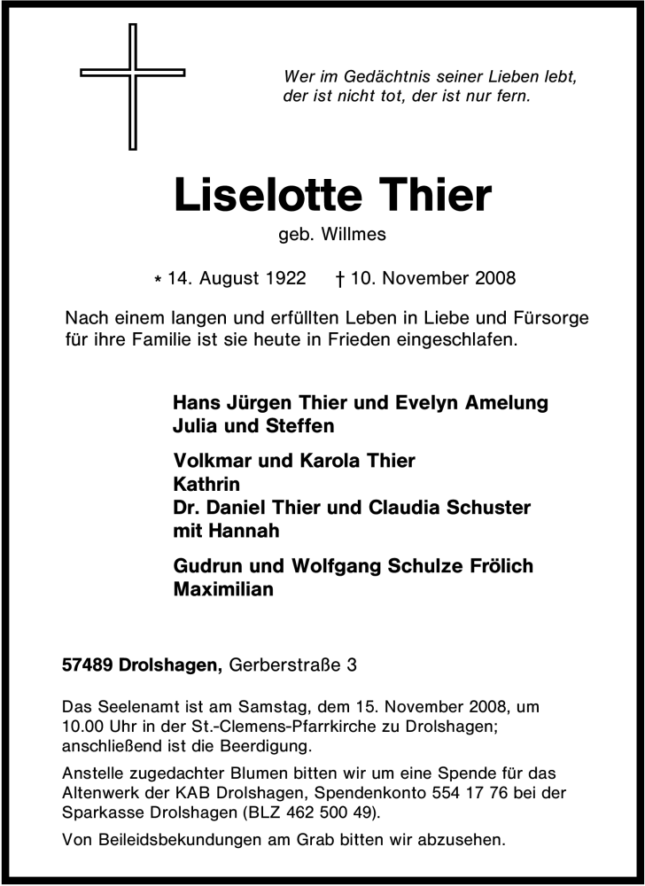 Hier finden Sie alle Traueranzeigen aus der Zeitung, die bisher für Liselotte Thier erschienen sind. Weitere Traueranzeigen, die in der Zeitung erscheinen, werden hier ebenfalls aufgelistet