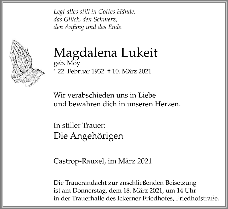 Hier finden Sie alle Traueranzeigen aus der Zeitung, die bisher für Magdalena Lukeit erschienen sind. Weitere Traueranzeigen, die in der Zeitung erscheinen, werden hier ebenfalls aufgelistet