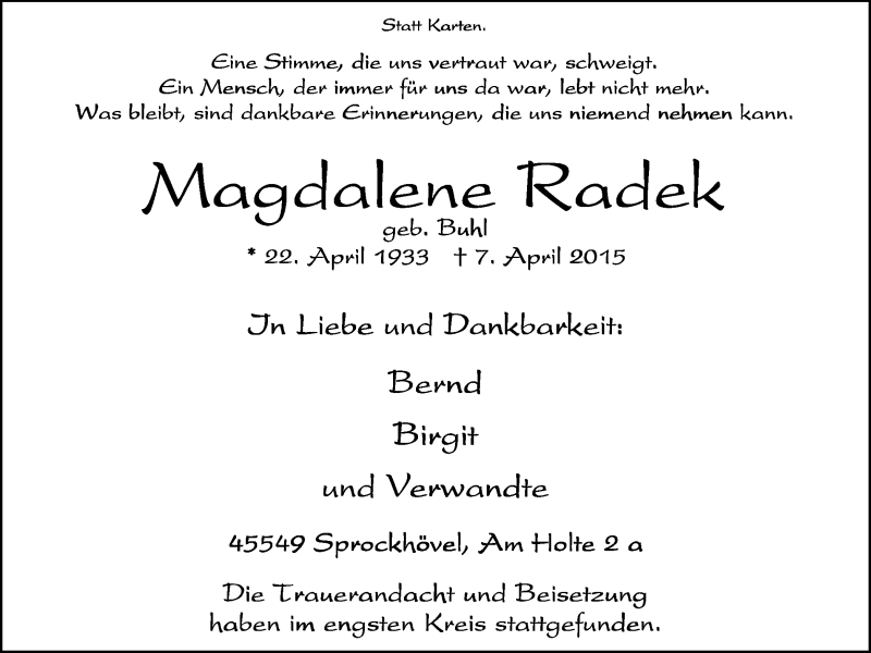 Hier finden Sie alle Traueranzeigen aus der Zeitung, die bisher für Magdalene Radek erschienen sind. Weitere Traueranzeigen, die in der Zeitung erscheinen, werden hier ebenfalls aufgelistet