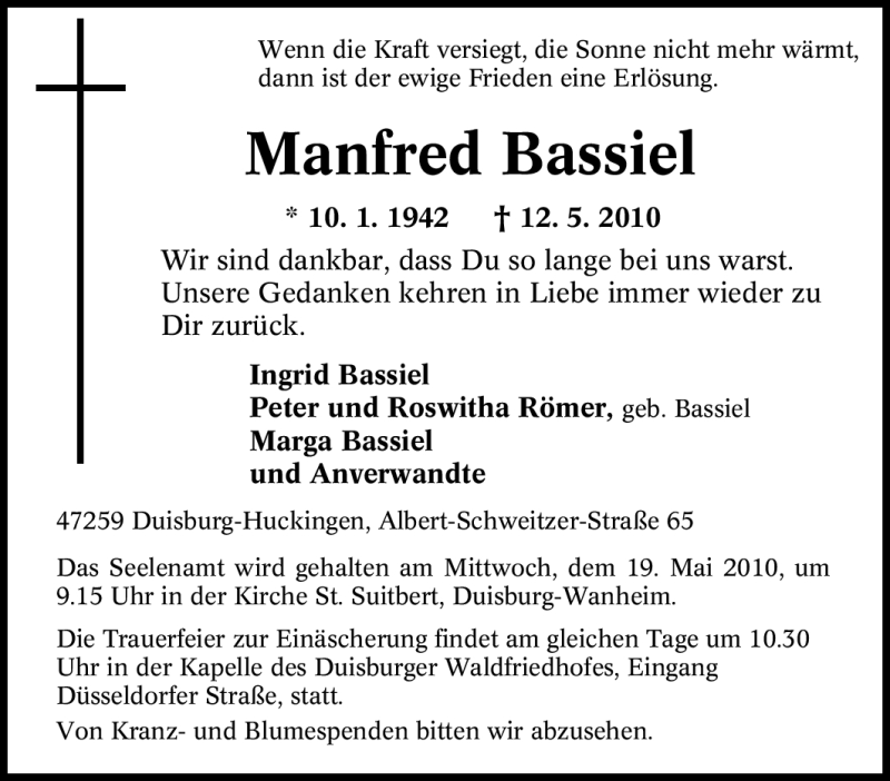 Hier finden Sie alle Traueranzeigen aus der Zeitung, die bisher für Manfred Bassiel erschienen sind. Weitere Traueranzeigen, die in der Zeitung erscheinen, werden hier ebenfalls aufgelistet
