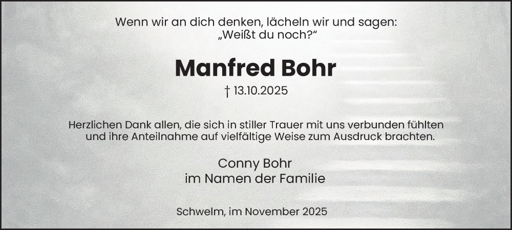 Hier finden Sie alle Traueranzeigen aus der Zeitung, die bisher für Manfred Bohr erschienen sind. Weitere Traueranzeigen, die in der Zeitung erscheinen, werden hier ebenfalls aufgelistet