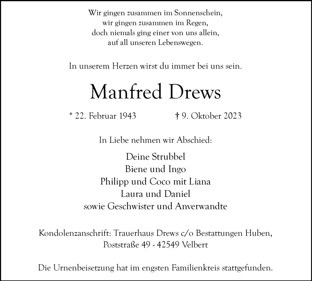 Hier finden Sie alle Traueranzeigen aus der Zeitung, die bisher für Manfred Drews erschienen sind. Weitere Traueranzeigen, die in der Zeitung erscheinen, werden hier ebenfalls aufgelistet