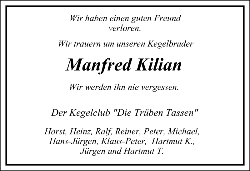 Hier finden Sie alle Traueranzeigen aus der Zeitung, die bisher für Manfred Kilian erschienen sind. Weitere Traueranzeigen, die in der Zeitung erscheinen, werden hier ebenfalls aufgelistet