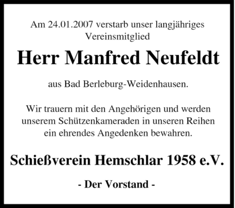 Hier finden Sie alle Traueranzeigen aus der Zeitung, die bisher für Manfred Neufeldt erschienen sind. Weitere Traueranzeigen, die in der Zeitung erscheinen, werden hier ebenfalls aufgelistet