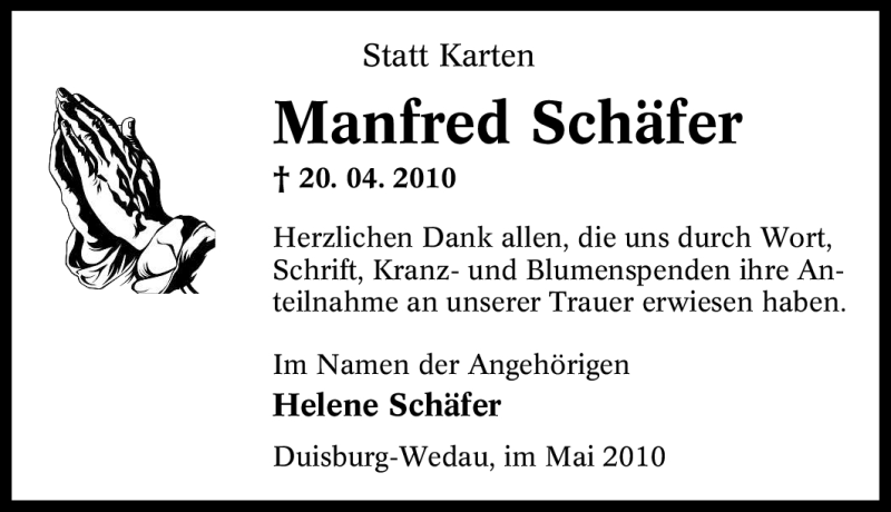 Hier finden Sie alle Traueranzeigen aus der Zeitung, die bisher für Manfred Schäfer erschienen sind. Weitere Traueranzeigen, die in der Zeitung erscheinen, werden hier ebenfalls aufgelistet