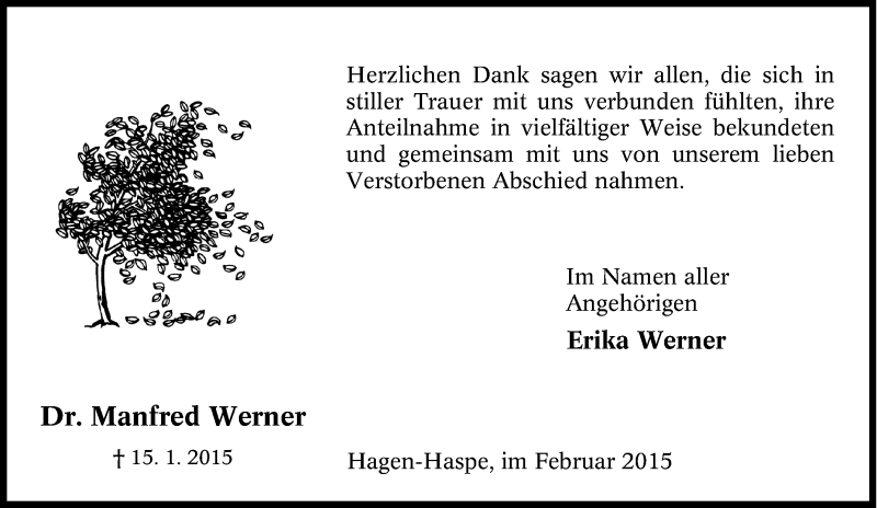 Hier finden Sie alle Traueranzeigen aus der Zeitung, die bisher für Manfred Werner erschienen sind. Weitere Traueranzeigen, die in der Zeitung erscheinen, werden hier ebenfalls aufgelistet