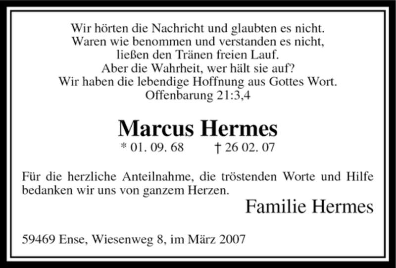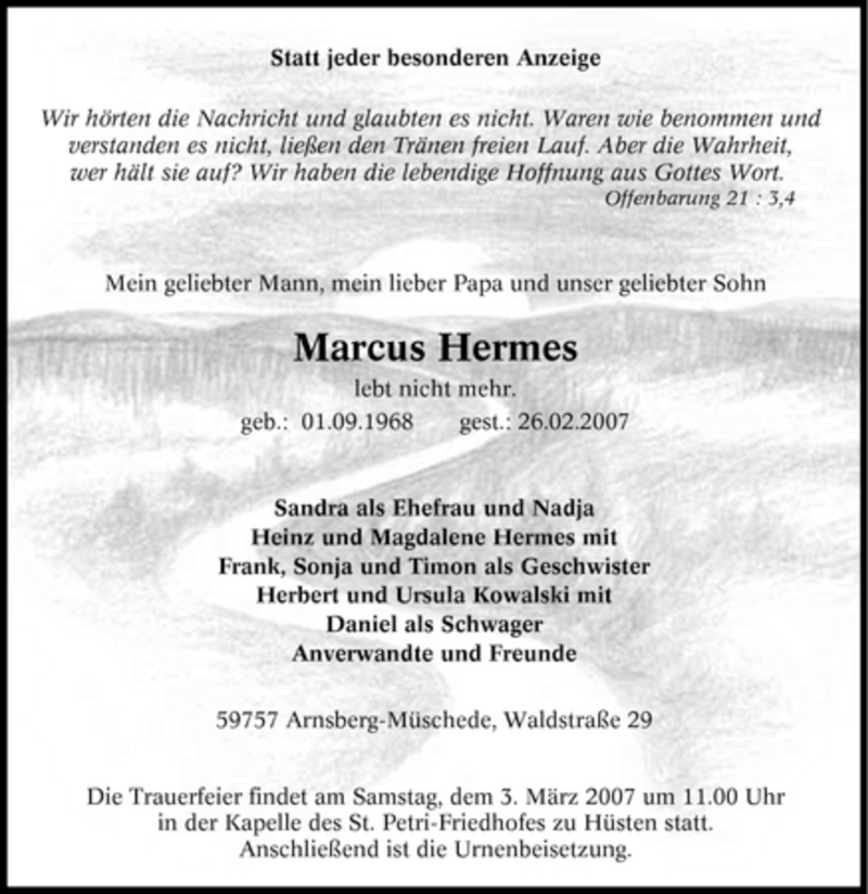 Hier finden Sie alle Traueranzeigen aus der Zeitung, die bisher für Marcus Hermes erschienen sind. Weitere Traueranzeigen, die in der Zeitung erscheinen, werden hier ebenfalls aufgelistet
